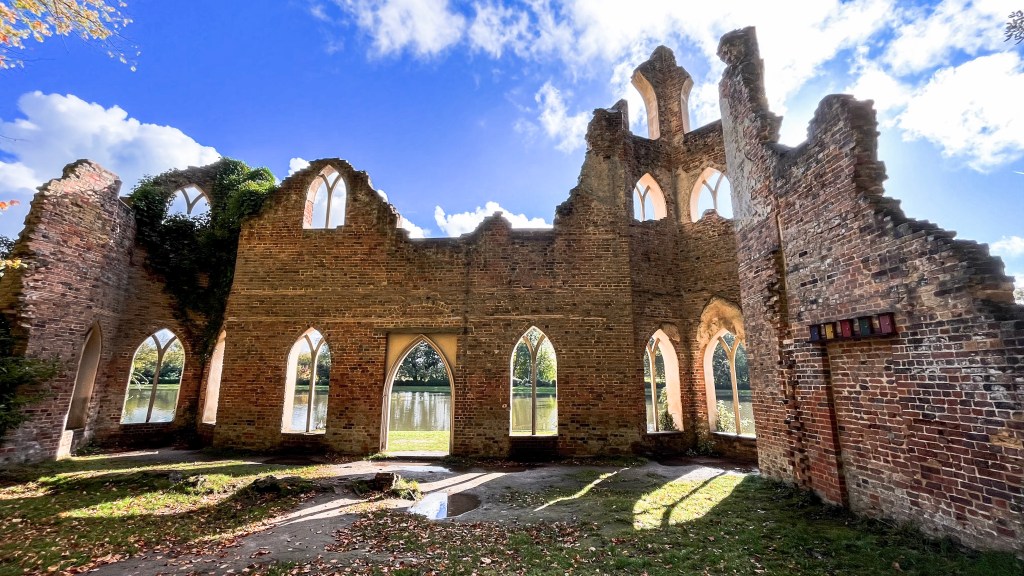 Near the beginning of the park, if you follow the path that winds through the woodland alongside the vineyards, you’ll emerge into the shelter of the Ruined Abbey which overlooks a secluded part of the lake. This is a beautiful, quiet area of the park, and you can get some great photos from multiple angles – especially from across the lake, with the Abbey reflected perfectly in the waters.