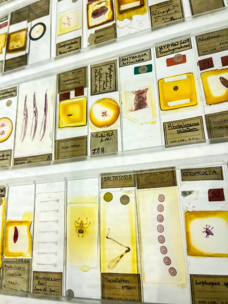 This is one of the most unique things about the Grant Museum of Zoology. This quirky installation pays homage to the fact that 95% of known animal species are smaller than your thumb. An old storeroom has been backlit and repurposed into a miniature display of over 2,000 lantern slides containing some of our planet’s tiniest specimens, which students can check out like books from a library. These range from rare insect wings, to mammoth hair, to a platypus’ tooth. There’s even complete specimens, such as a whole squid, measuring only 2mm long, and a beetle 1/10th of a mm thick!