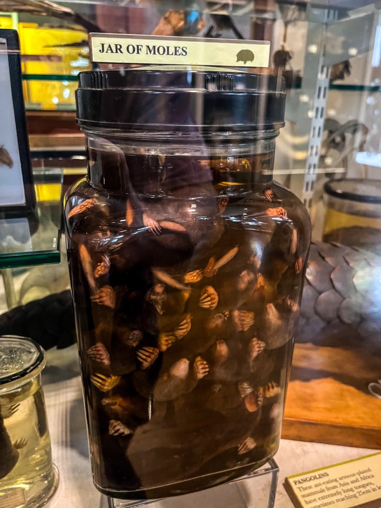 And of course, somehow the strangest of all: the infamous jar of moles. 18 little guys squeezed into a single jar. The museum suggests that they’re stored like this because back in the day, glass jars and preservation fluid were expensive, so this was the cheapest option. It also made it easier for storage and transportation, and as the museum was once an institution for studying comparative anatomy, they were probably once intended for students of a dissection class. Explanation aside, it’s an incredibly weird thing to see.